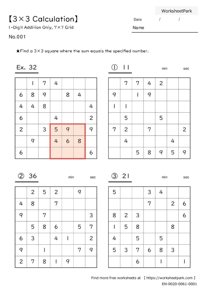 Brain Training Number Puzzles 【3×3 Calculation】1-Digit Addition Only (7×7 Grid) File Info: PDF format, A4 SizeTerms: Free for personal & educational use PrintableRecommended Download PDFWorksheetAnswer KeyFull Set View PDF