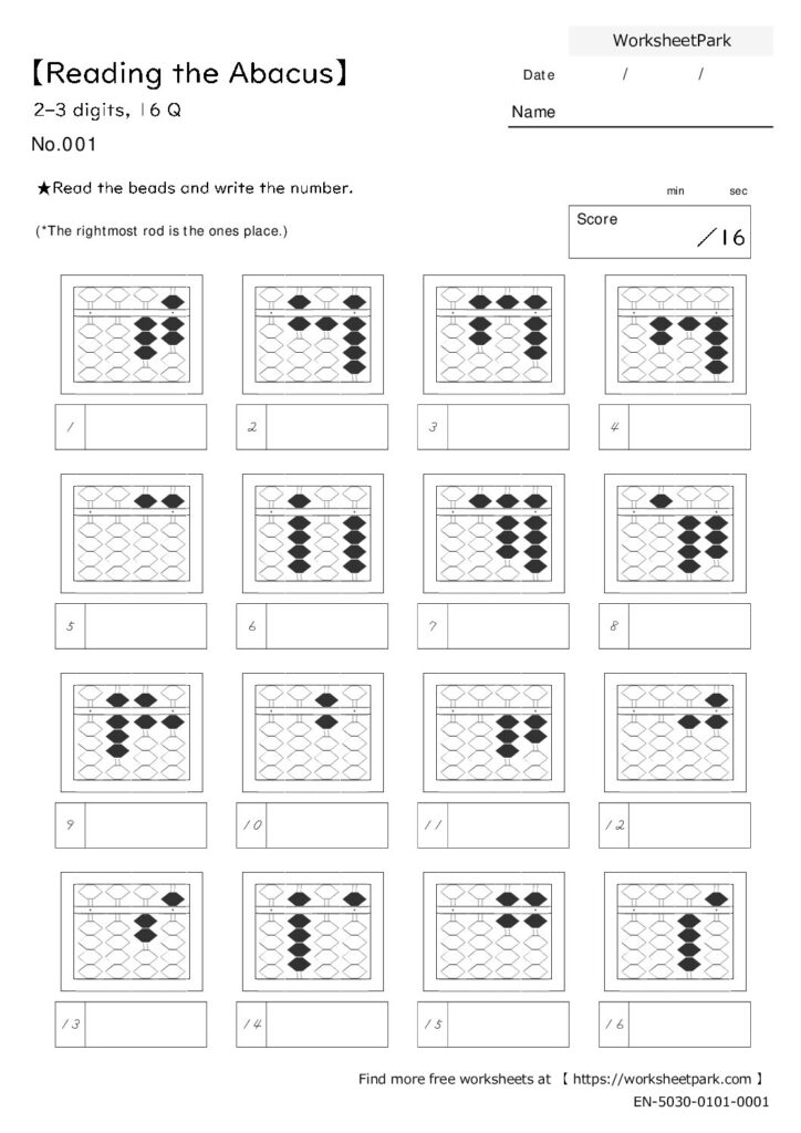 Abacus Practice Abacus Worksheets 【Reading the Abacus】 2–3 digits , 16Q File Info: PDF format, A4 SizeTerms: Free for personal & educational use PrintableRecommended Download PDFWorksheetAnswer KeyFull Set View PDF